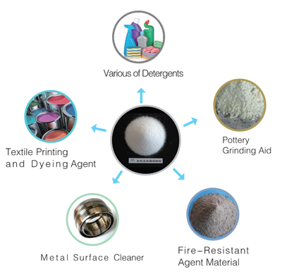 Properties: Melting point is 1089 ℃ . It is easily dissolved in water and difficult dissolved in ethanol and acid. The solution is slightly alkaline. It is easily to absorb moisture when it is stocked in the open air. It has characters of decontamination, decentralization, wetness, penetrability, and PH value buffer capacity.