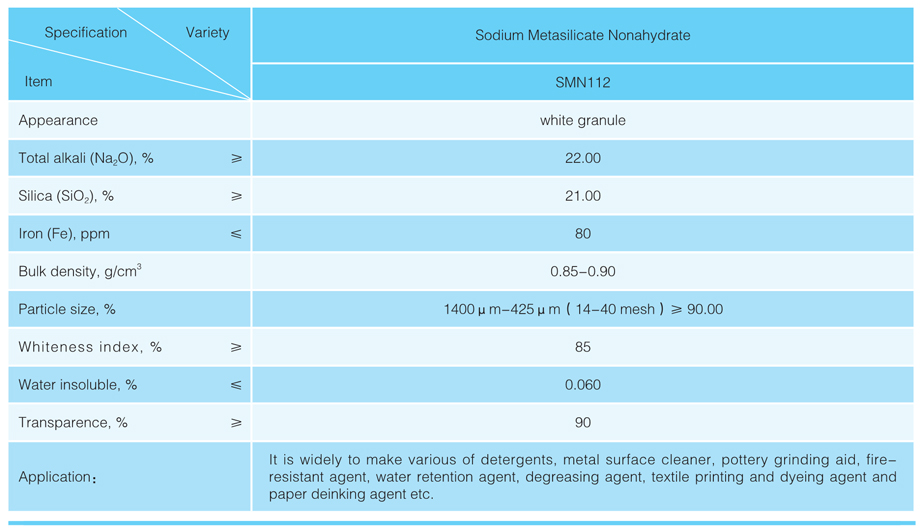 Standard compliance: HG/T 2568-2008《 Industrial Sodium Metasilicate》, Enterprise Standard Q-PG/ll-02-18-J《 Industrial Sodium Metasilicate》.